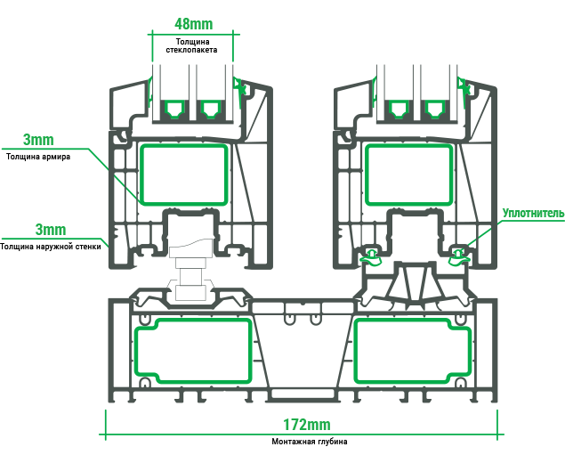Звуко- і теплоізоляція. Забезпечується завдяки щільному і герметичному примикання стулки до основним профілем . Також залежить від застосовуваного склопакета